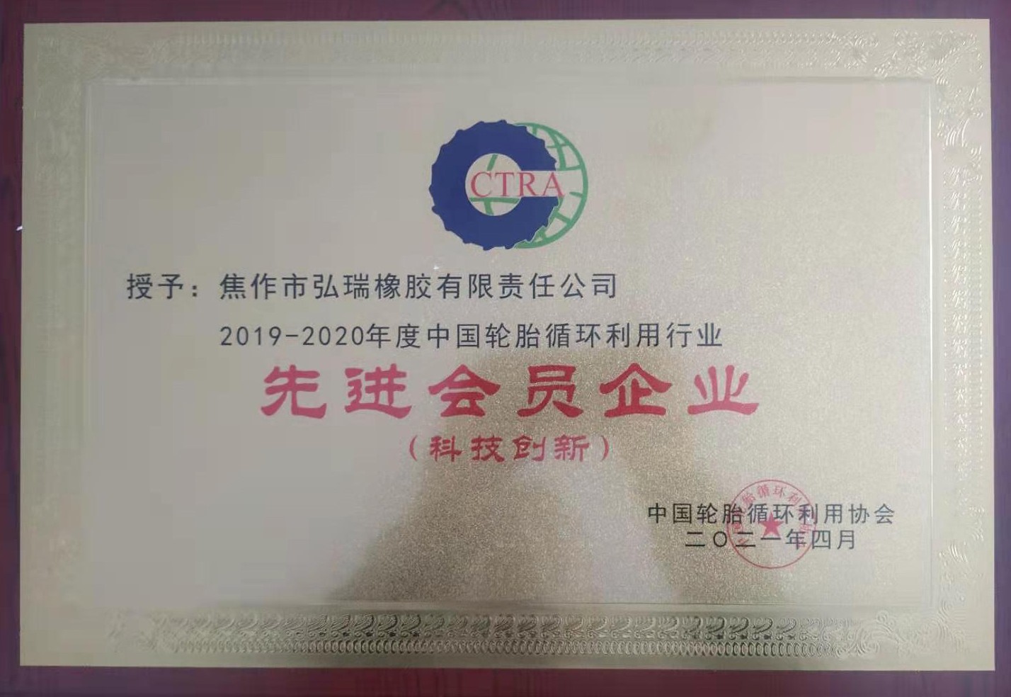 公司榮獲中國輪胎循環(huán)利用協(xié)會(huì)多項(xiàng)榮譽(yù)稱號(hào)